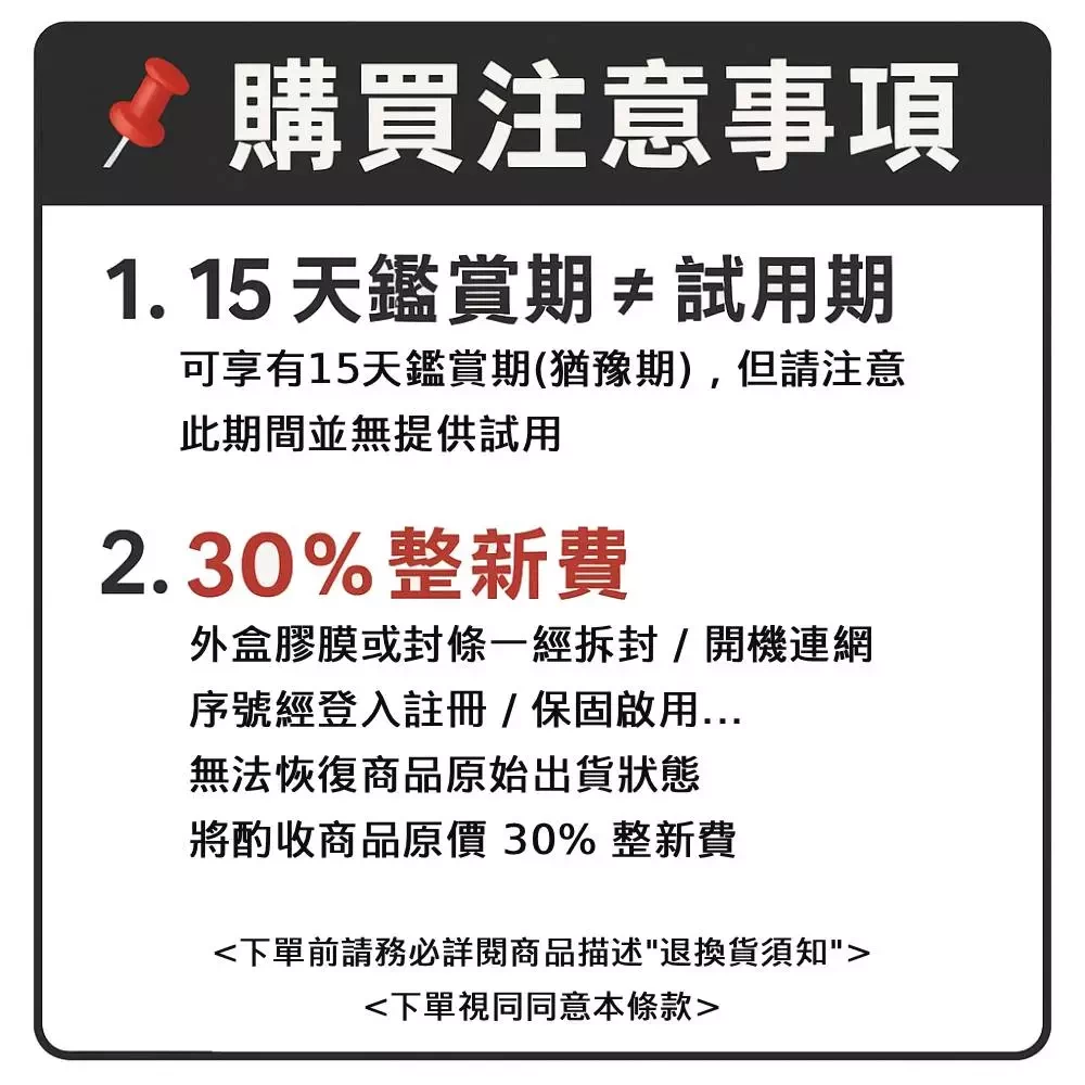 ★ 辦理退貨時,商品需保持完整狀態(包含 原廠包裝、配件、贈品 等)。如商品經 拆封、註冊,且非新品瑕疵問題,將酌收商品原價 30% 整新費。